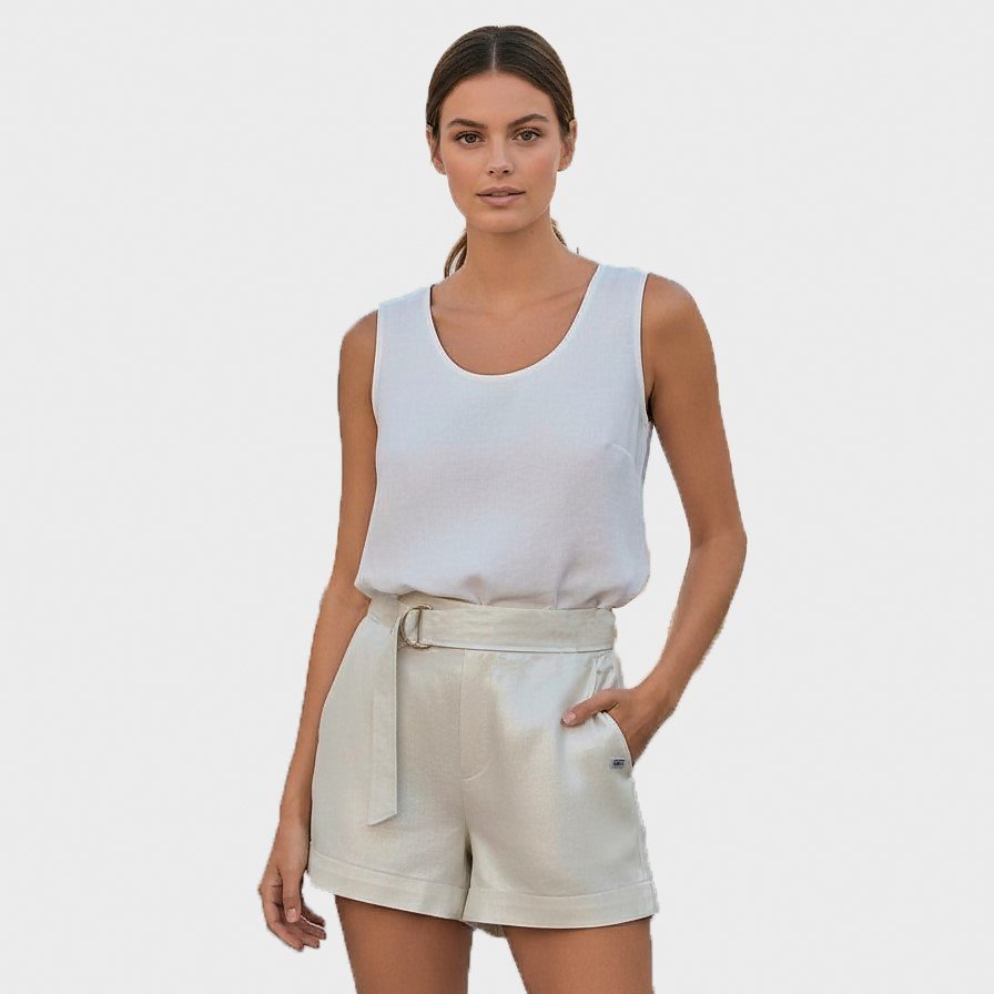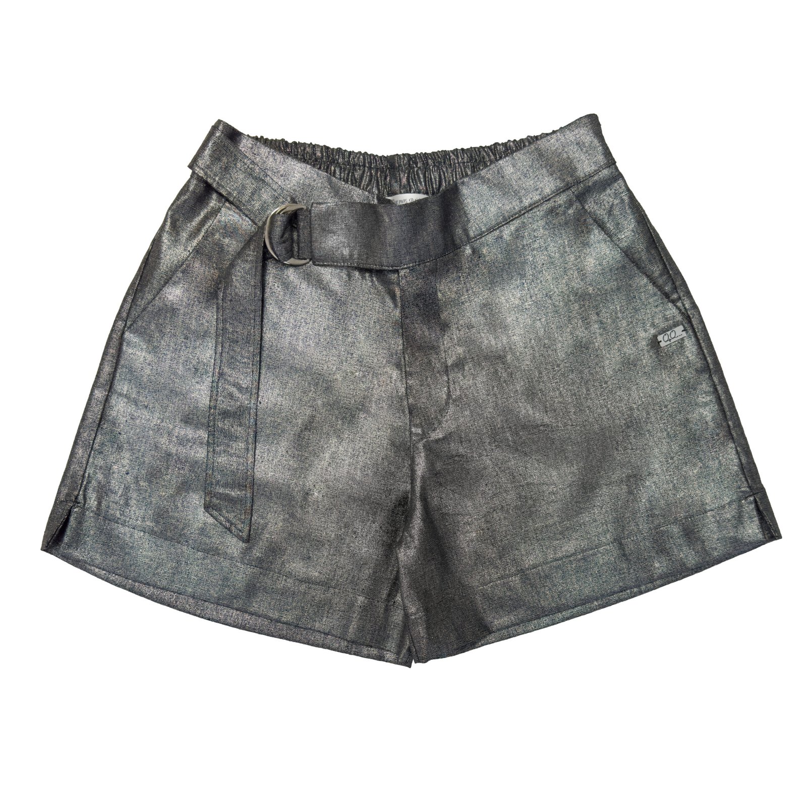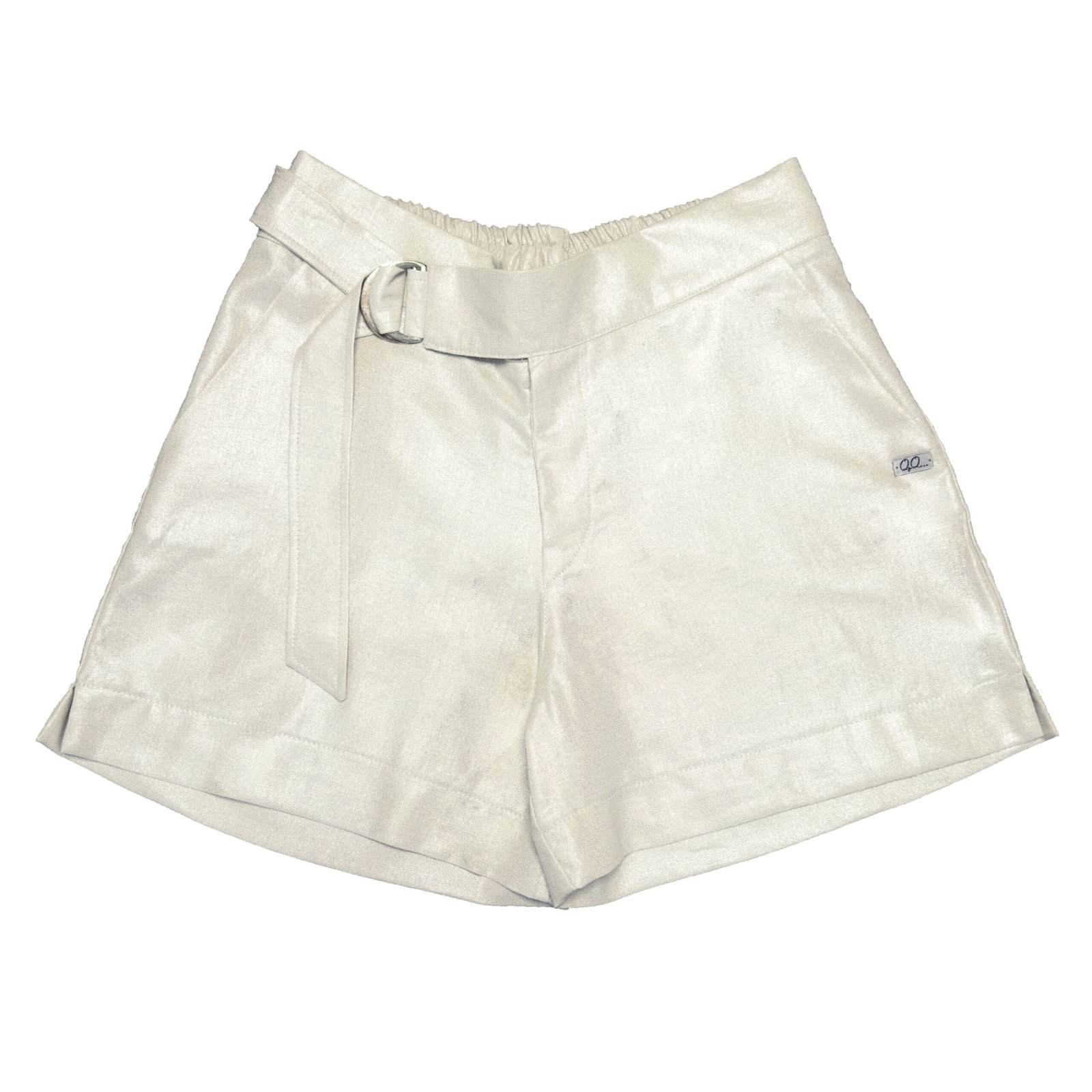 Bermuda de lino foil (brillo) con bolsillos, lazo y hebilla metálica en cintura delantera.