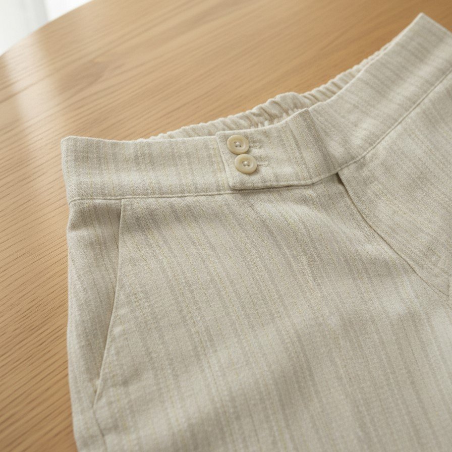 Bolsillos delanteros, y cintura cruzada con botones.
