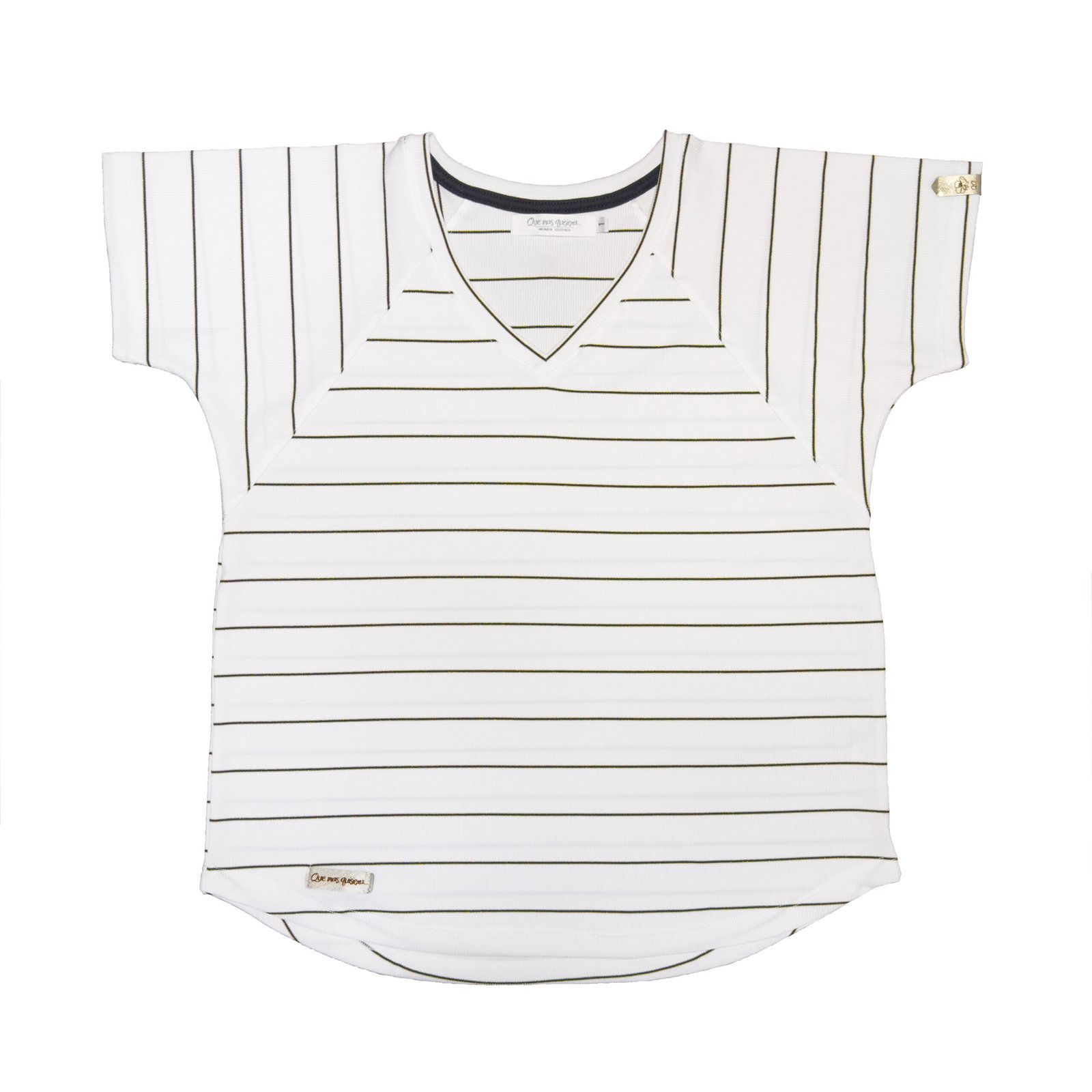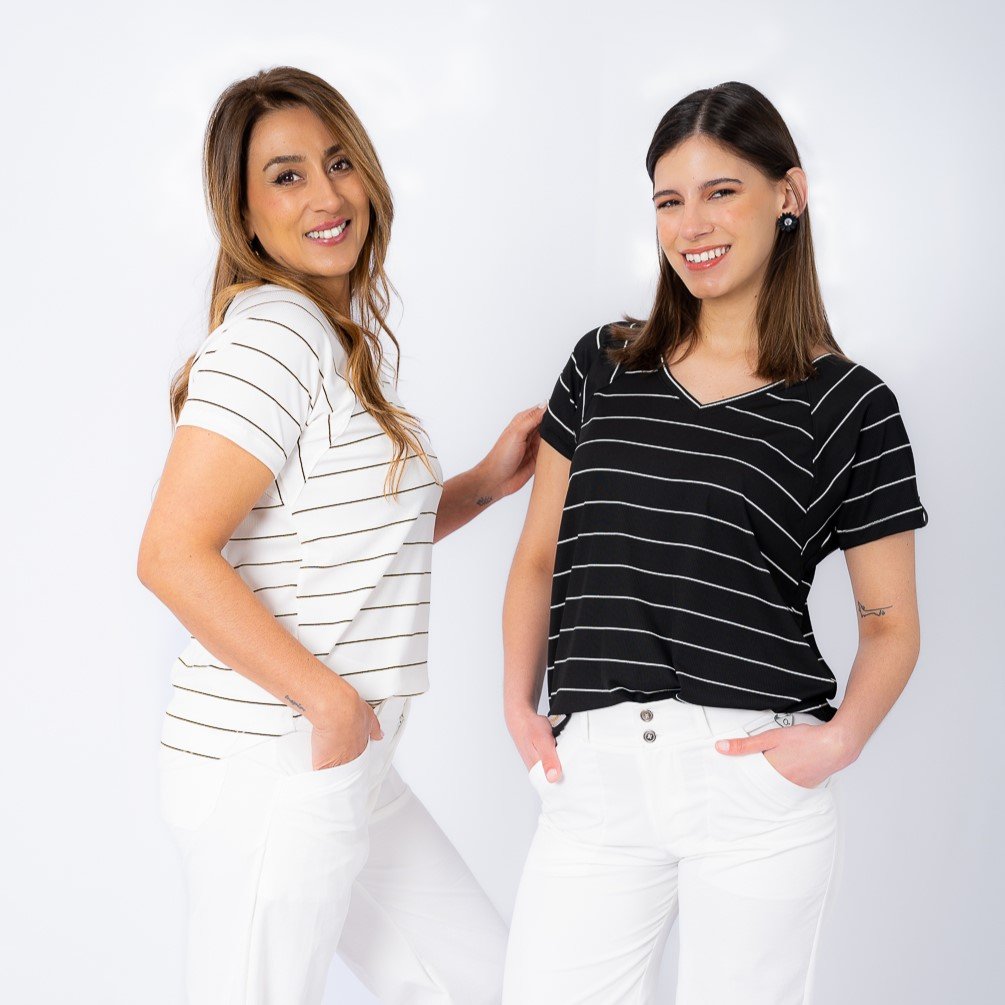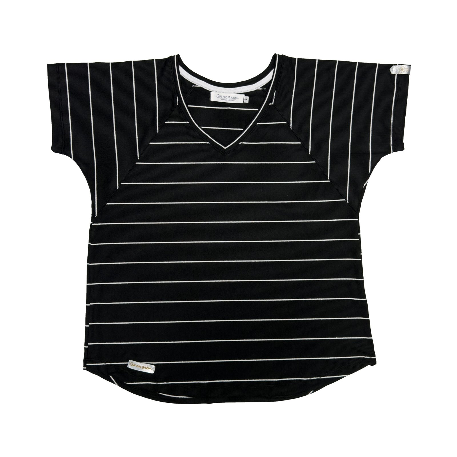 Remera de morley con lurex, escote “v”, manga raglan y aplique de lentejuelas en espalda.